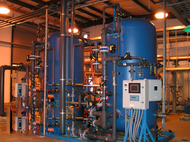 水處理的沉淀和澄清過程,把水中一部分較大的固體顆粒或容易沉降的雜質加以去除,但要進一步使水凈化,就得利用過濾的方法,使水通過石英砂過濾器中從上而下、由小而大的不同顆粒的濾料層后,將水中的細小顆粒、膠體、有機物等雜質截留下來,從而使水得到進一步的澄清和凈化,降低水的渾濁度。根據(jù)設備水頭損失的情況或過濾器運行的時間確定石英砂過濾器的反沖時機。通過石英砂過濾器上所配置的各類閥體的開合對設備內部石英砂濾料進行反沖洗,將沉積在介質上的雜物沖洗干凈后,設備隨即又進入了一個新的過濾周期。